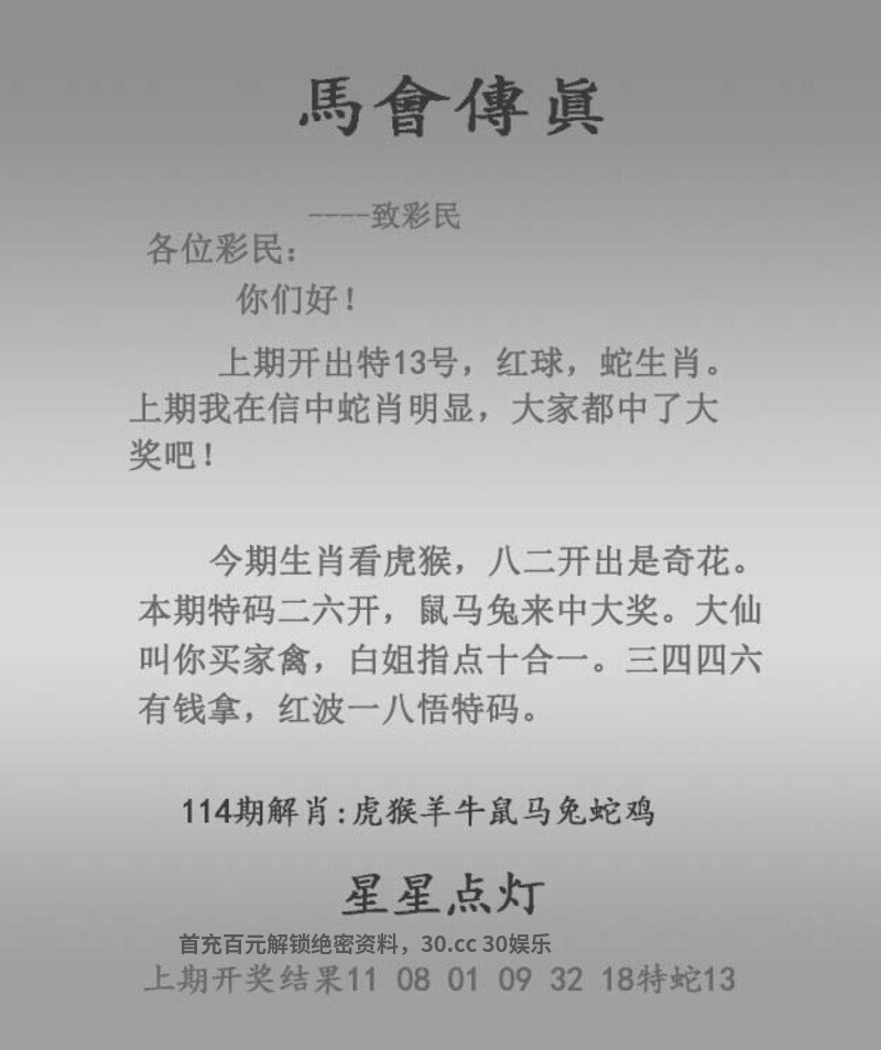 114期马会传真: 今期生肖看虎猴,八二开出是奇花。本期特码二六开,鼠马兔来中大奖。大仙叫你买家禽,白姐指点十合一。三四四六有钱拿,红波一八悟特码。 星星点灯 特围生肖:虎猴羊牛鼠马兔蛇鸡 |